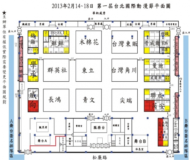 明年首屆由中華動漫出版同業協進會主辦的「台北國際動漫節」,將於 2013 年 2 月 14 日(大年初五)至 2 月 18 日於台北世貿二館開展,而官方也搶先公布了參展廠商的展位平面圖、以及策劃的展覽相關資訊,以下即為官方所提供之詳細資訊。